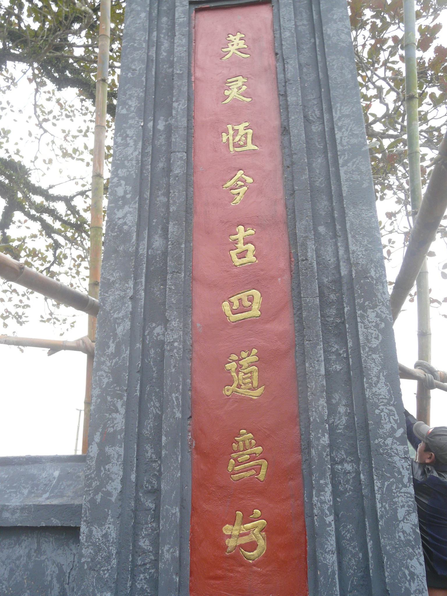 Con cháu chụp ảnh kỷ niệm trước cổng Đền Gôi
