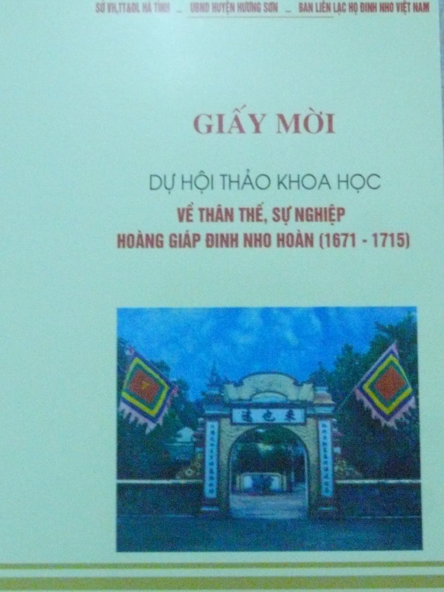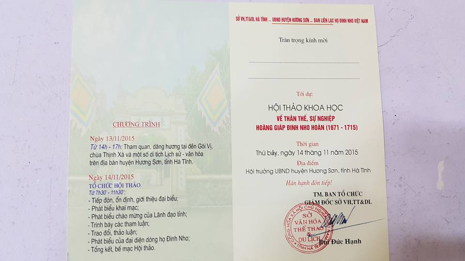 5. Các Đại biểu, Khách mời sẽ có mặt tại Hội trường UBND huyện Hương Sơn chậm nhất là 15h ngày 13/11/2015 để nhận phòng nghỉ, tài liệu và chụp hình lưu niệm (để kịp trao tặng trước khi Hội thảo khai mạc ngày 14/11/2015), sau đó sẽ lên đường hành hương về dâng hương tại Đền Gôi, Nhà thờ Họ Đinh Nho và Đền Thịnh Xá (nếu còn đủ thời gian) và trở về địa điểm tập kết để ăn tối, giao lưu và nghỉ ngơi.